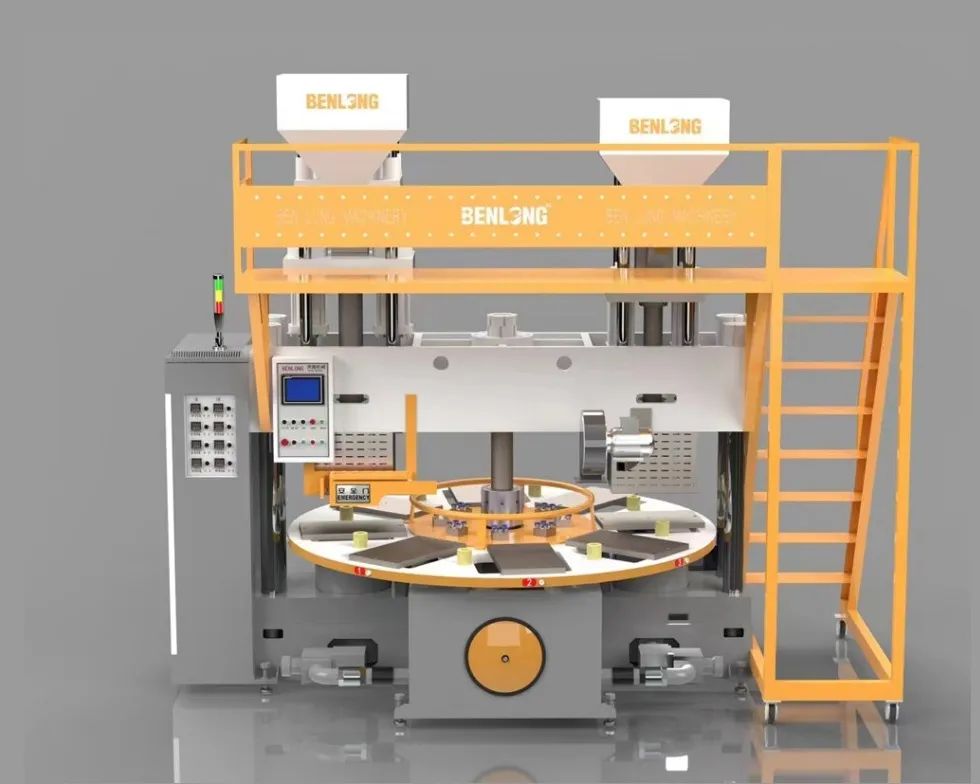 圓盤式立式雙色鞋底注射成型機(jī),采用全電液伺服系統(tǒng),響應(yīng)快且節(jié)能;多工位圓盤設(shè)計(jì)實(shí)現(xiàn)注射、冷卻、取件等工序不間斷循環(huán),大幅提升產(chǎn)量。